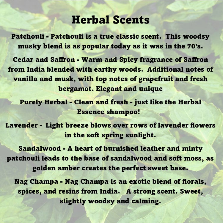6 Pack Soy Coo Scents in "Herbal" Theme. Set includes a 2.5 ounce, 6 cube bar in each of the following: Purely Herbal, Nag Champa, Sandalwood, Patchouli, Cedar and Saffron and Lavender. Comes in a sturdy box for easy storage and gift wrapping!