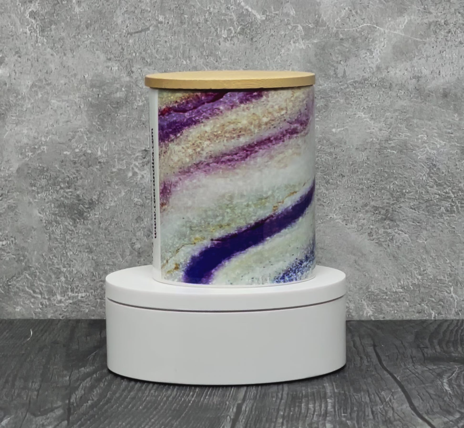 This is more than a candle - it's a work of art! Burn time 60+ hours. Jar measures 4" tall and 3.25" in diameter. Made with our new coconut wax blend. This ceramic candle can be washed and reused after the burn is complete!