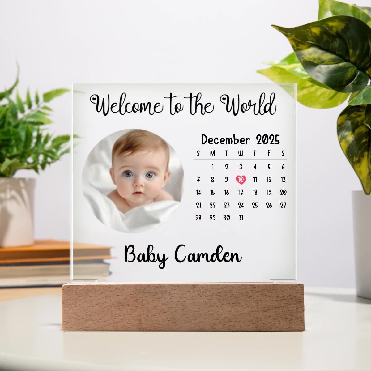 Your plaque will be crafted from premium acrylic with a professionally printed design for a polished look. It comes with a stylish wooden LED base that is battery-operated. (requires 2 AAA batteries, not included). Base features 7 vibrant colors, allowing the user to customize the lighting with various color changes and dynamic cycles.